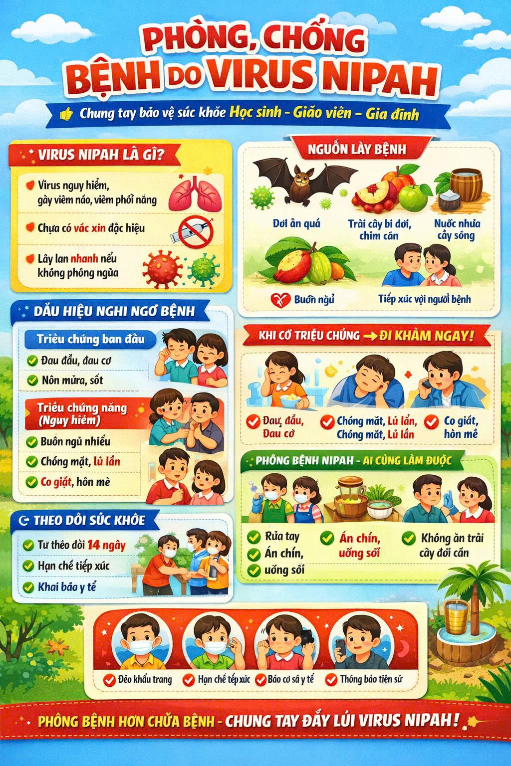 Để chủ động, phòng chống dịch bệnh do virus Nipah, Bộ Y tế khuyến cáo người dân hạn chế đến khu vực có dịch bệnh do virus Nipah nếu không thực sự cần thiết. Tự theo dõi sức khỏe, trong vòng 14 ngày kể từ khi về từ vùng dịch, nếu có các triệu chứng như: đau đầu, đau cơ, nôn mửa và đau họng, chóng mặt, buồn ngủ, lú lẫn, co giật cần liên hệ ngay với cơ sở y tế gần nhất, hạn chế tiếp xúc với người khác, thông báo rõ tiền sử dịch tễ cho nhân viên y tế. Đồng thời, đảm bảo vệ sinh thực phẩm, thực hiện “ăn chín, uống sôi”, rửa sạch và gọt vỏ trái cây trước khi ăn, không ăn, uống các loại trái cây có dấu hiệu bị động vật (dơi, chim) cắn hoặc gặm nhấm; tránh uống nước nhựa cây (như nhựa cây thốt nốt, nhựa dừa sống hoặc chưa qua chế biến). Không tiếp xúc gần với động vật có khả năng lây truyền cao như là dơi ăn quả; thường xuyên rửa tay bằng xà phòng hoặc dung dịch sát khuẩn sau khi giết mổ, tiếp xúc với động vật. Hạn chế tiếp xúc trực tiếp với người bệnh, vật phẩm ô nhiễm từ người bệnh; cần sử dụng khẩu trang, găng tay và đồ bảo hộ cá nhân khi chăm sóc, điều trị người nghi ngờ, mắc bệnh, sau đó rửa tay bằng xà phòng hoặc dung dịch sát khuẩn.